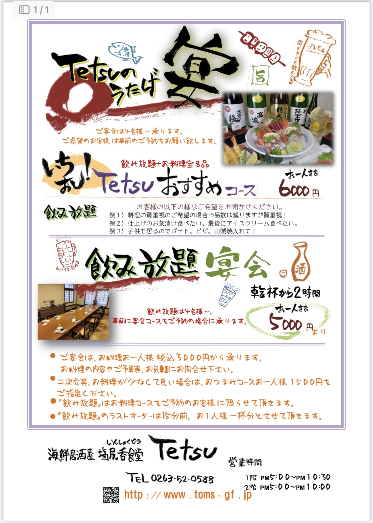お料理お一人様3,000円~、1グループ4名様~承ります。